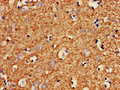 IHC image of CSB-PA013551LA01HU diluted at 1:400 and staining in paraffin-embedded human brain tissue performed on a Leica BondTM system. After dewaxing and hydration, antigen retrieval was mediated by high pressure in a citrate buffer (pH 6.0). Section was blocked with 10% normal goat serum 30min at RT. Then primary antibody (1% BSA) was incubated at 4°C overnight. The primary is detected by a biotinylated secondary antibody and visualized using an HRP conjugated SP system.