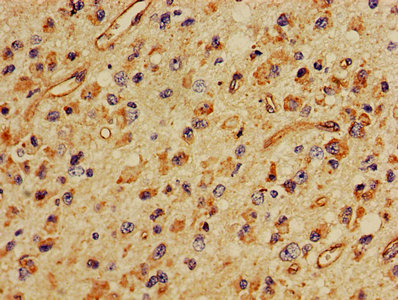 IHC image of CSB-PA013551LA01HU diluted at 1:400 and staining in paraffin-embedded human glioma performed on a Leica BondTM system. After dewaxing and hydration, antigen retrieval was mediated by high pressure in a citrate buffer (pH 6.0). Section was blocked with 10% normal goat serum 30min at RT. Then primary antibody (1% BSA) was incubated at 4°C overnight. The primary is detected by a biotinylated secondary antibody and visualized using an HRP conjugated SP system.