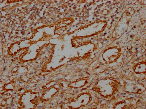 IHC image of CSB-PA617930LA01HU diluted at 1:100 and staining in paraffin-embedded human lung tissue performed on a Leica BondTM system. After dewaxing and hydration, antigen retrieval was mediated by high pressure in a citrate buffer (pH 6.0). Section was blocked with 10% normal goat serum 30min at RT. Then primary antibody (1% BSA) was incubated at 4°C overnight. The primary is detected by a Goat anti-rabbit IgG labeled by HRP and visualized using 0.05% DAB.