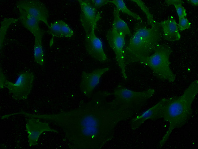 Immunofluorescence staining of U251 cells with CSB-PA013579LA01HU at 1:50, counter-stained with DAPI. The cells were fixed in 4% formaldehyde, permeabilized using 0.2% Triton X-100 and blocked in 10% normal Goat Serum. The cells were then incubated with the antibody overnight at 4°C. The secondary antibody was Alexa Fluor 488-congugated AffiniPure Goat Anti-Rabbit IgG(H+L).