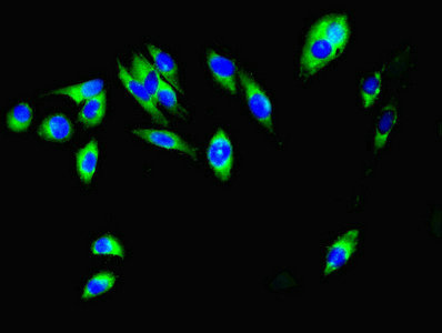 Immunofluorescent analysis of Hela cells using CSB-PA03829A0Rb at dilution of 1:100 and Alexa Fluor 488-congugated AffiniPure Goat Anti-Rabbit IgG(H+L)