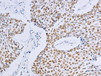 The image on the left is immunohistochemistry of paraffin-embedded Human lung cancer tissue using CSB-PA578532(MCM2 Antibody) at dilution 1/20, on the right is treated with fusion protein. (Original magnification: ×200)