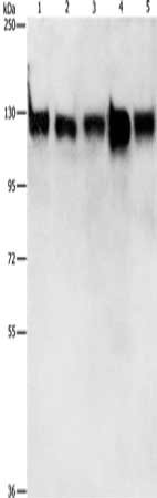 Gel: 6%SDS-PAGE, Lysate: 40 μg, Lane 1-5: 293T cells, hela cells, K562 cells, Raji cells, 231 cells, Primary antibody: CSB-PA578532(MCM2 Antibody) at dilution 1/400, Secondary antibody: Goat anti rabbit IgG at 1/8000 dilution, Exposure time: 1 second