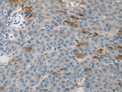The image on the left is immunohistochemistry of paraffin-embedded Human liver cancer tissue using CSB-PA217530(MCMBP Antibody) at dilution 1/40, on the right is treated with synthetic peptide. (Original magnification: ×200)