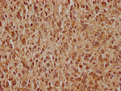 IHC image of CSB-PA11628A0Rb diluted at 1:400 and staining in paraffin-embedded human glioma performed on a Leica BondTM system. After dewaxing and hydration, antigen retrieval was mediated by high pressure in a citrate buffer (pH 6.0). Section was blocked with 10% normal goat serum 30min at RT. Then primary antibody (1% BSA) was incubated at 4°C overnight. The primary is detected by a biotinylated secondary antibody and visualized using an HRP conjugated SP system.