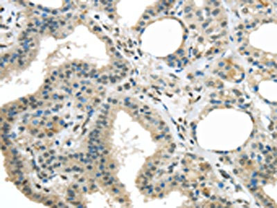 The image on the left is immunohistochemistry of paraffin-embedded Human thyroid cancer tissue using CSB-PA087753(MED15 Antibody) at dilution 1/20, on the right is treated with fusion protein. (Original magnification: ×200)