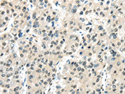 The image on the left is immunohistochemistry of paraffin-embedded Human liver cancer tissue using CSB-PA997169(MED18 Antibody) at dilution 1/20, on the right is treated with fusion protein. (Original magnification: ×200)