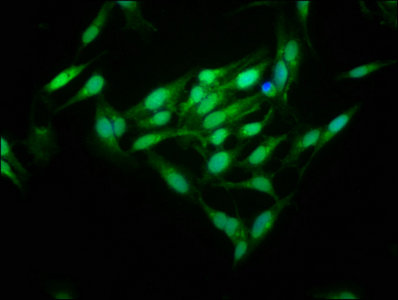 Immunofluorescence staining of Hela cells with CSB-PA873607LA01HU at 1:125, counter-stained with DAPI. The cells were fixed in 4% formaldehyde, permeabilized using 0.2% Triton X-100 and blocked in 10% normal Goat Serum. The cells were then incubated with the antibody overnight at 4°C. The secondary antibody was Alexa Fluor 488-congugated AffiniPure Goat Anti-Rabbit IgG(H+L).