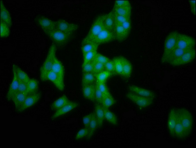 Immunofluorescence staining of HepG2 cells with CSB-PA875665LA01HU at 1:100, counter-stained with DAPI. The cells were fixed in 4% formaldehyde, permeabilized using 0.2% Triton X-100 and blocked in 10% normal Goat Serum. The cells were then incubated with the antibody overnight at 4°C. The secondary antibody was Alexa Fluor 488-congugated AffiniPure Goat Anti-Rabbit IgG(H+L).