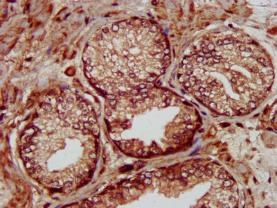 IHC image of CSB-PA875665LA01HU diluted at 1:300 and staining in paraffin-embedded human prostate cancer performed on a Leica BondTM system. After dewaxing and hydration, antigen retrieval was mediated by high pressure in a citrate buffer (pH 6.0). Section was blocked with 10% normal goat serum 30min at RT. Then primary antibody (1% BSA) was incubated at 4°C overnight. The primary is detected by a biotinylated secondary antibody and visualized using an HRP conjugated SP system.