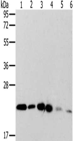 Gel: 10%SDS-PAGE, Lysate: 40 μg, Lane 1-6: Hela cells, hepg2 cells, lncap cells, K562 cells, Jurkat cells, A549 cells, Primary antibody: CSB-PA158054(MRPL11 Antibody) at dilution 1/300, Secondary antibody: Goat anti rabbit IgG at 1/8000 dilution, Exposure time: 15 seconds