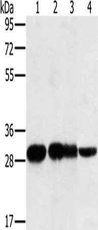 Gel: 8%SDS-PAGE, Lysate: 40 μg, Lane 1-4: 293T cells, A549 cells, human testis tissue, mouse thymus tissue, Primary antibody: CSB-PA558364(MRPL28 Antibody) at dilution 1/300, Secondary antibody: Goat anti rabbit IgG at 1/8000 dilution, Exposure time: 5 seconds