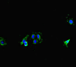 Immunofluorescent analysis of Hela cells using CSB-PA015072LA01HU at dilution of 1:100 and Alexa Fluor 488-congugated AffiniPure Goat Anti-Rabbit IgG(H+L)
