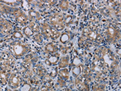 The image on the left is immunohistochemistry of paraffin-embedded Human thyroid cancer tissue using CSB-PA575736(MTBP Antibody) at dilution 1/20, on the right is treated with synthetic peptide. (Original magnification: ×200)