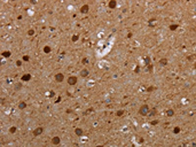The image on the left is immunohistochemistry of paraffin-embedded Human brain tissue using CSB-PA575736(MTBP Antibody) at dilution 1/20, on the right is treated with synthetic peptide. (Original magnification: ×200)