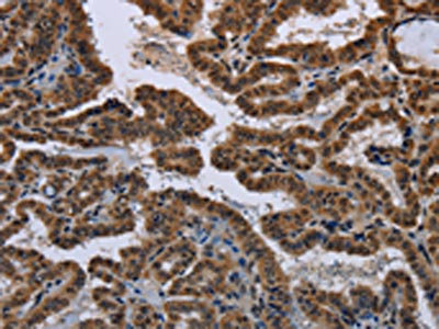 The image on the left is immunohistochemistry of paraffin-embedded Human thyroid cancer tissue using CSB-PA965036(MYCN Antibody) at dilution 1/50, on the right is treated with synthetic peptide. (Original magnification: ×200)