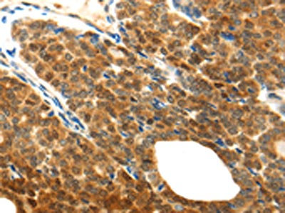 The image on the left is immunohistochemistry of paraffin-embedded Human breast cancer tissue using CSB-PA995911(MYD88 Antibody) at dilution 1/20, on the right is treated with fusion protein. (Original magnification: ×200)