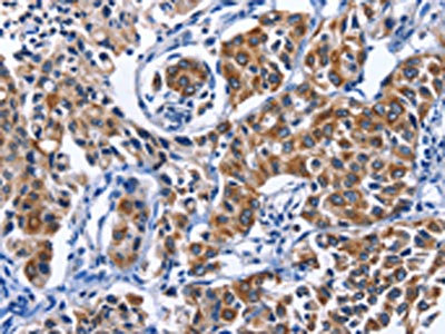 The image on the left is immunohistochemistry of paraffin-embedded Human lung cancer tissue using CSB-PA791340(MYH1 Antibody) at dilution 1/40, on the right is treated with fusion protein. (Original magnification: ×200)