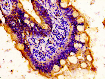 IHC image of CSB-PA773786LA01HU diluted at 1:100 and staining in paraffin-embedded human small intestine tissue performed on a Leica BondTM system. After dewaxing and hydration, antigen retrieval was mediated by high pressure in a citrate buffer (pH 6.0). Section was blocked with 10% normal goat serum 30min at RT. Then primary antibody (1% BSA) was incubated at 4°C overnight. The primary is detected by a biotinylated secondary antibody and visualized using an HRP conjugated ABC system.