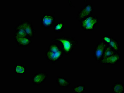 Immunofluorescence staining of MCF-7 cells with CSB-PA773786LA01HU at 1:100, counter-stained with DAPI. The cells were fixed in 4% formaldehyde, permeabilized using 0.2% Triton X-100 and blocked in 10% normal Goat Serum. The cells were then incubated with the antibody overnight at 4°C. The secondary antibody was Alexa Fluor 488-congugated AffiniPure Goat Anti-Rabbit IgG(H+L).