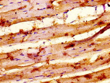 IHC image of CSB-PA716576LA01HU diluted at 1:500 and staining in paraffin-embedded human skeletal muscle tissue performed on a Leica BondTM system. After dewaxing and hydration, antigen retrieval was mediated by high pressure in a citrate buffer (pH 6.0). Section was blocked with 10% normal goat serum 30min at RT. Then primary antibody (1% BSA) was incubated at 4°C overnight. The primary is detected by a biotinylated secondary antibody and visualized using an HRP conjugated SP system.