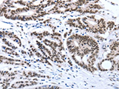 The image on the left is immunohistochemistry of paraffin-embedded Human colon cancer tissue using CSB-PA130852(Map2 Antibody) at dilution 1/25, on the right is treated with synthetic peptide. (Original magnification: ×200)