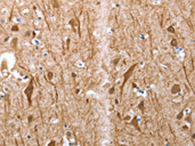 The image on the left is immunohistochemistry of paraffin-embedded Human brain tissue using CSB-PA130852(Map2 Antibody) at dilution 1/25, on the right is treated with synthetic peptide. (Original magnification: ×200)