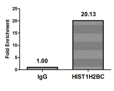 Chromatin Immunoprecipitation Hela (4*106) were treated with Micrococcal Nuclease, sonicated, and immunoprecipitated with 5µg anti-HIST1H2BC (CSB-PA010403OA20me1HU) or a control normal rabbit IgG. The resulting ChIP DNA was quantified using real-time PCR with primers against the β-Globin promoter.