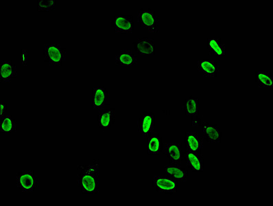Immunofluorescent analysis of Hela cells using CSB-PA010418PA36me1HU at dilution of 1:100 and Alexa Fluor 488-congugated AffiniPure Goat Anti-Rabbit IgG(H+L)