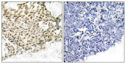 Immunohistochemical analysis of paraffin-embedded human breast carcinoma tissue using p95/NBS1(Ab-343) Antibody(left) or the same antibody preincubated with blocking peptide(right).