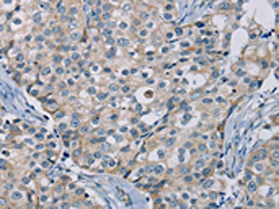 The image on the left is immunohistochemistry of paraffin-embedded Human breast cancer tissue using CSB-PA121181(NDUFS7 Antibody) at dilution 1/20, on the right is treated with fusion protein. (Original magnification: ×200)