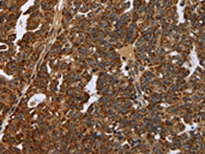 The image on the left is immunohistochemistry of paraffin-embedded Human ovarian cancer tissue using CSB-PA111065(NEFH Antibody) at dilution 1/40, on the right is treated with synthetic peptide. (Original magnification: ×200)