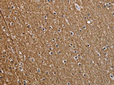 The image on the left is immunohistochemistry of paraffin-embedded Human brain tissue using CSB-PA298176(NEFM Antibody) at dilution 1/25, on the right is treated with synthetic peptide. (Original magnification: ×200)