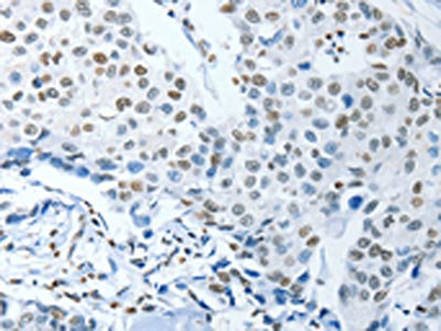 The image on the left is immunohistochemistry of paraffin-embedded Human breast cancer tissue using CSB-PA225643(NEK4 Antibody) at dilution 1/25, on the right is treated with synthetic peptide. (Original magnification: ×200)