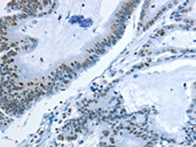 The image on the left is immunohistochemistry of paraffin-embedded Human colon cancer tissue using CSB-PA225643(NEK4 Antibody) at dilution 1/25, on the right is treated with synthetic peptide. (Original magnification: ×200)