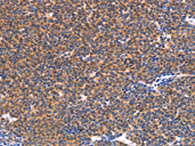 The image on the left is immunohistochemistry of paraffin-embedded Human lymphoma tissue using CSB-PA094270(NES Antibody) at dilution 1/30, on the right is treated with synthetic peptide. (Original magnification: ×200)