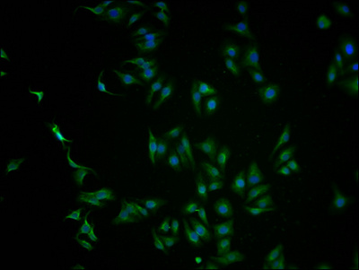 Immunofluorescence staining of HepG2 cells with CSB-PA614961LA01HU at 1:100, counter-stained with DAPI. The cells were fixed in 4% formaldehyde and blocked in 10% normal Goat Serum. The cells were then incubated with the antibody overnight at 4°C. The secondary antibody was Alexa Fluor 488-congugated AffiniPure Goat Anti-Rabbit IgG(H+L).