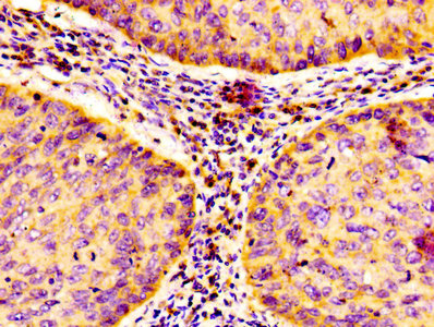 IHC image of CSB-PA10354A0Rb diluted at 1:100 and staining in paraffin-embedded human cervical cancer performed on a Leica BondTM system. After dewaxing and hydration, antigen retrieval was mediated by high pressure in a citrate buffer (pH 6.0). Section was blocked with 10% normal goat serum 30min at RT. Then primary antibody (1% BSA) was incubated at 4°C overnight. The primary is detected by a biotinylated secondary antibody and visualized using an HRP conjugated ABC system.