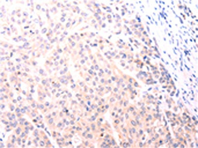 The image on the left is immunohistochemistry of paraffin-embedded Human esophagus cancer tissue using CSB-PA439037(NFKBIE Antibody) at dilution 1/25, on the right is treated with fusion protein. (Original magnification: ×200)