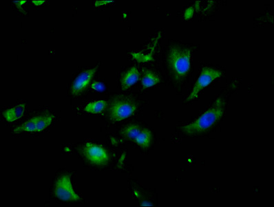 Immunofluorescence staining of U251 cells with CSB-PA873703LA01HU at 1:200, counter-stained with DAPI. The cells were fixed in 4% formaldehyde, permeabilized using 0.2% Triton X-100 and blocked in 10% normal Goat Serum. The cells were then incubated with the antibody overnight at 4°C. The secondary antibody was Alexa Fluor 488-congugated AffiniPure Goat Anti-Rabbit IgG(H+L).