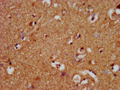 IHC image of CSB-PA773044LA01HU diluted at 1:400 and staining in paraffin-embedded human brain tissue performed on a Leica BondTM system. After dewaxing and hydration, antigen retrieval was mediated by high pressure in a citrate buffer (pH 6.0). Section was blocked with 10% normal goat serum 30min at RT. Then primary antibody (1% BSA) was incubated at 4°C overnight. The primary is detected by a biotinylated secondary antibody and visualized using an HRP conjugated SP system.