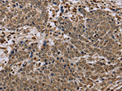 The image on the left is immunohistochemistry of paraffin-embedded Human liver cancer tissue using CSB-PA034681(NLRP4 Antibody) at dilution 1/40, on the right is treated with synthetic peptide. (Original magnification: ×200)
