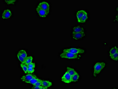 Immunofluorescent analysis of HepG2 cells using CSB-PA14099A0Rb at dilution of 1:100 and Alexa Fluor 488-congugated AffiniPure Goat Anti-Rabbit IgG(H+L)