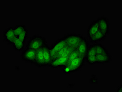 Immunofluorescent analysis of HepG2 cells using CSB-PA015942LA01HU at dilution of 1:100 and Alexa Fluor 488-congugated AffiniPure Goat Anti-Rabbit IgG(H+L)