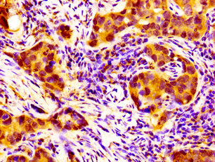 IHC image of CSB-PA860777LA01HU diluted at 1:100 and staining in paraffin-embedded human pancreatic cancer performed on a Leica BondTM system. After dewaxing and hydration, antigen retrieval was mediated by high pressure in a citrate buffer (pH 6.0). Section was blocked with 10% normal goat serum 30min at RT. Then primary antibody (1% BSA) was incubated at 4°C overnight. The primary is detected by a biotinylated secondary antibody and visualized using an HRP conjugated SP system.