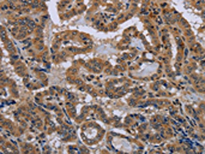 The image on the left is immunohistochemistry of paraffin-embedded Human thyroid cancer tissue using CSB-PA579527(NPHS2 Antibody) at dilution 1/40, on the right is treated with synthetic peptide. (Original magnification: ×200)