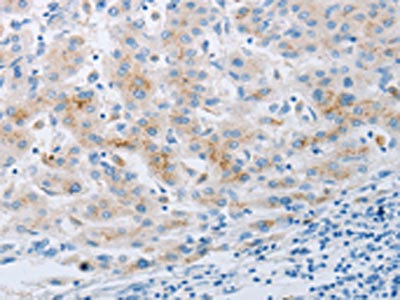 The image on the left is immunohistochemistry of paraffin-embedded Human liver cancer tissue using CSB-PA131945(NPY2R Antibody) at dilution 1/20, on the right is treated with synthetic peptide. (Original magnification: ×200)