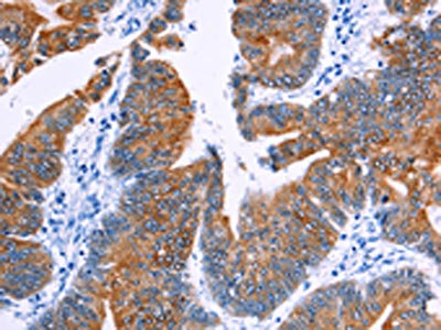 The image on the left is immunohistochemistry of paraffin-embedded Human colon cancer tissue using CSB-PA949280(NR4A2 Antibody) at dilution 1/20, on the right is treated with fusion protein. (Original magnification: ×200)