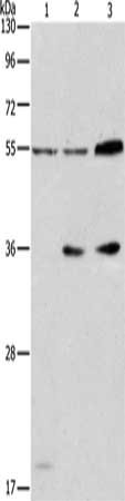 Gel: 10%SDS-PAGE, Lysate: 40 μg, Lane 1-3: Mouse testis tissue, A172 cells, Jurkat cells, Primary antibody: CSB-PA262646(NRG3 Antibody) at dilution 1/175, Secondary antibody: Goat anti rabbit IgG at 1/8000 dilution, Exposure time: 1 minute