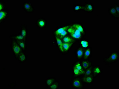 Immunofluorescence staining of HepG2 cells with CSB-PA016086LA01HU at 1:33, counter-stained with DAPI. The cells were fixed in 4% formaldehyde, permeabilized using 0.2% Triton X-100 and blocked in 10% normal Goat Serum. The cells were then incubated with the antibody overnight at 4°C. The secondary antibody was Alexa Fluor 488-congugated AffiniPure Goat Anti-Rabbit IgG(H+L).